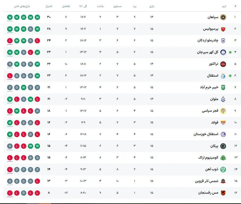 جدول لیگ برتر پس از شکست استقلال در برابر گل گهر را مشاهده می نمایید.